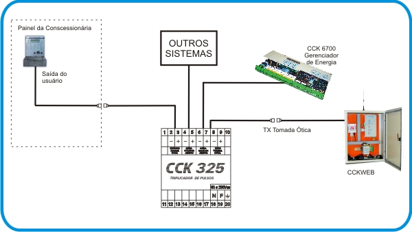 Módulo que triplica o sinal serial padrão ABNT CODI proveniente do medidor de energia da concessionária de energia elétrica. Possui uma entrada para tomada ótica receptora (sinal serial do usuário) do medidor da concessionária e três saídas, sendo duas com coletor aberto e uma para tomada ótica transmissora da concessionária.