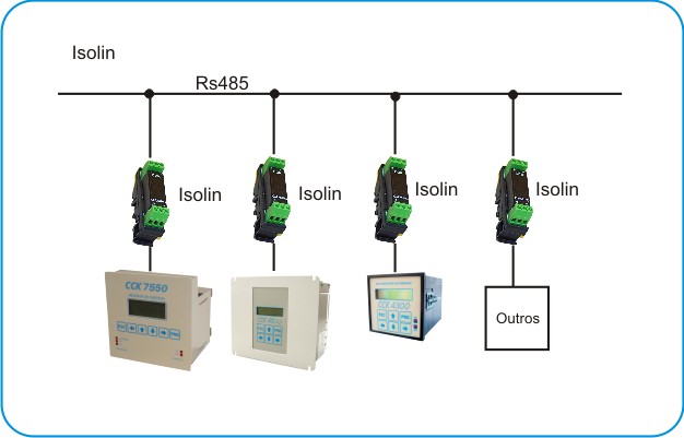 Elemento protetor para linhas de comunicação RS 485 contra decorrentes de cargas atmosféricas, tendo o seu projeto baseado na atuação em série de diversos dispositivos internos de proteção.